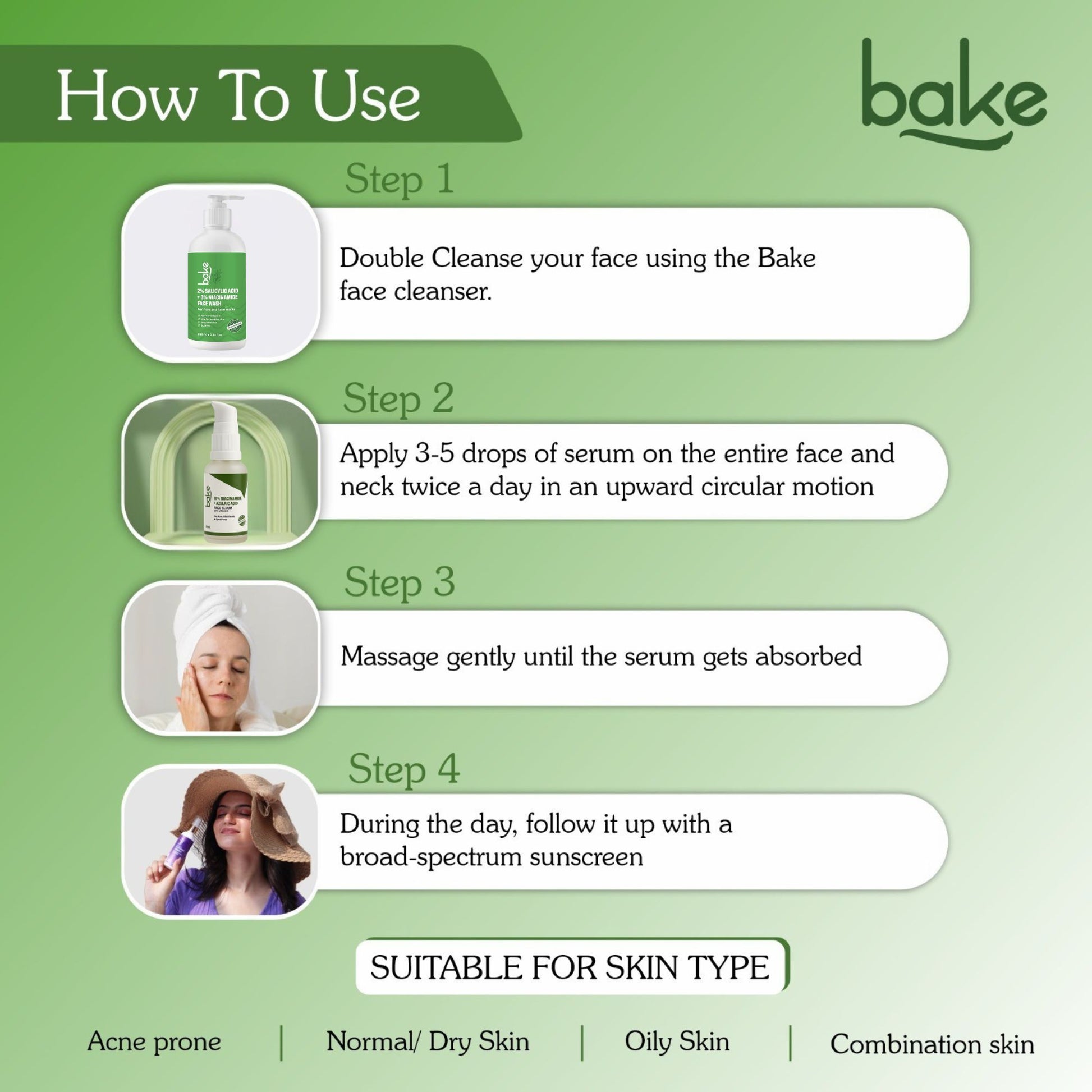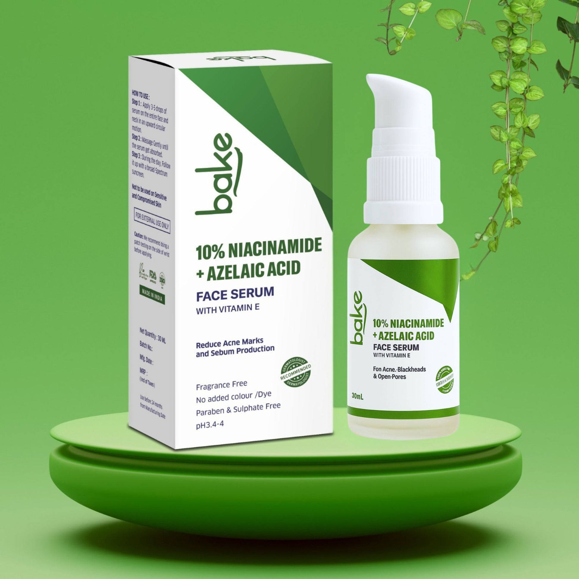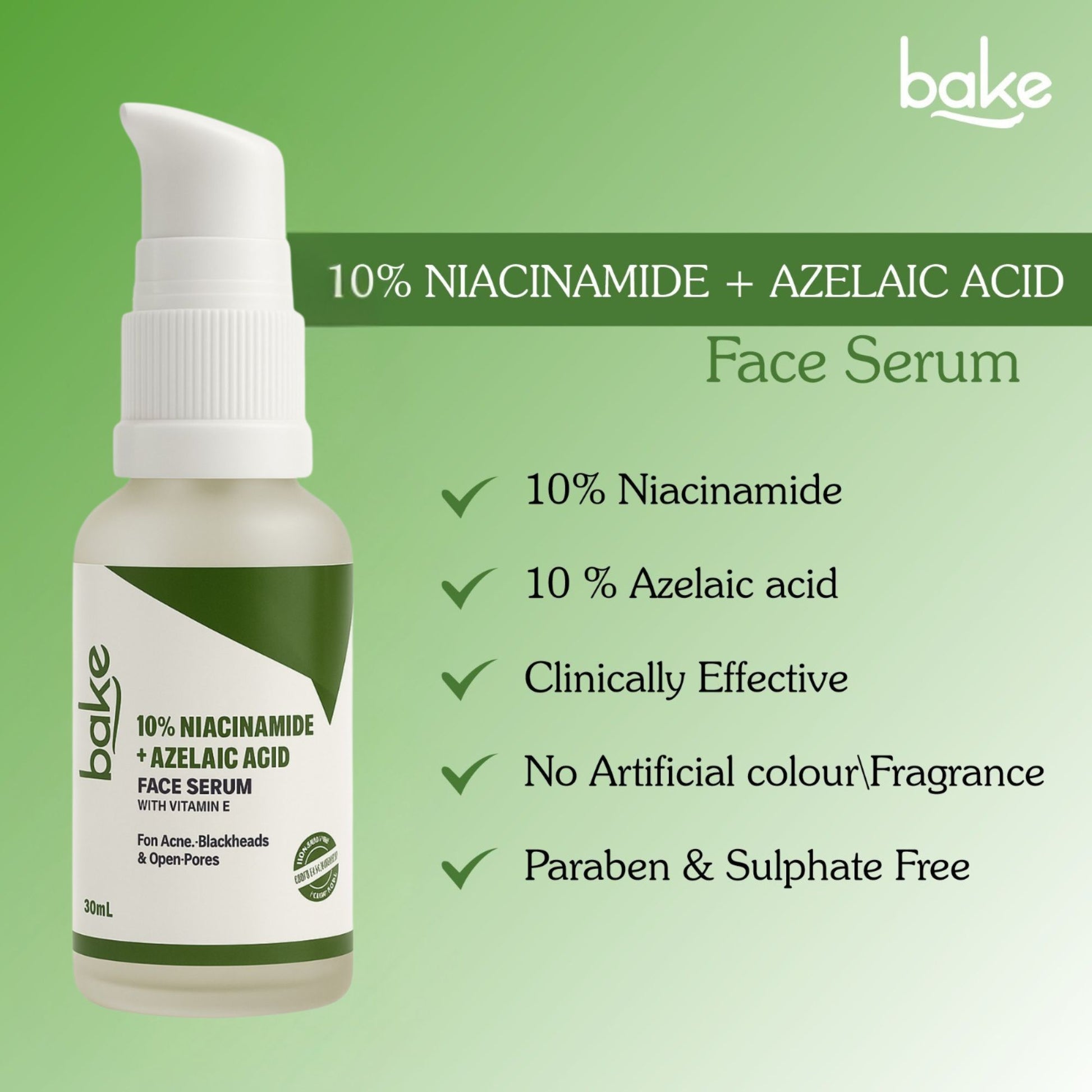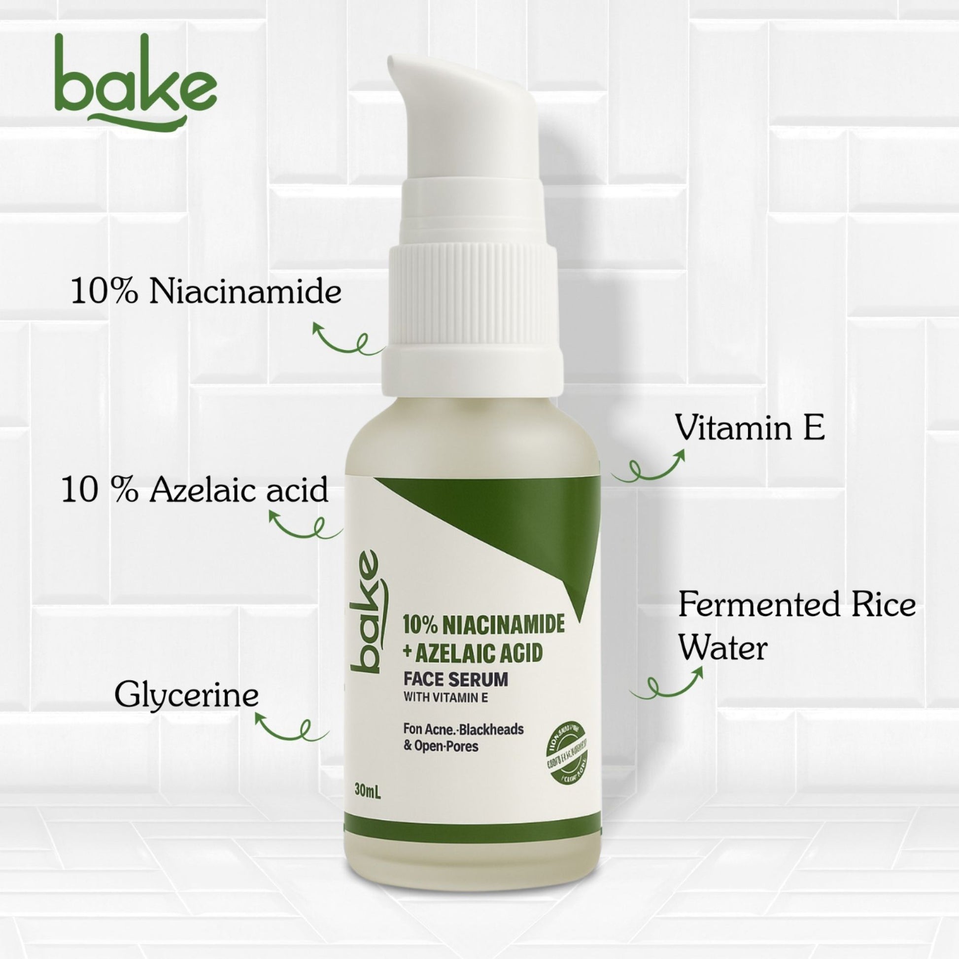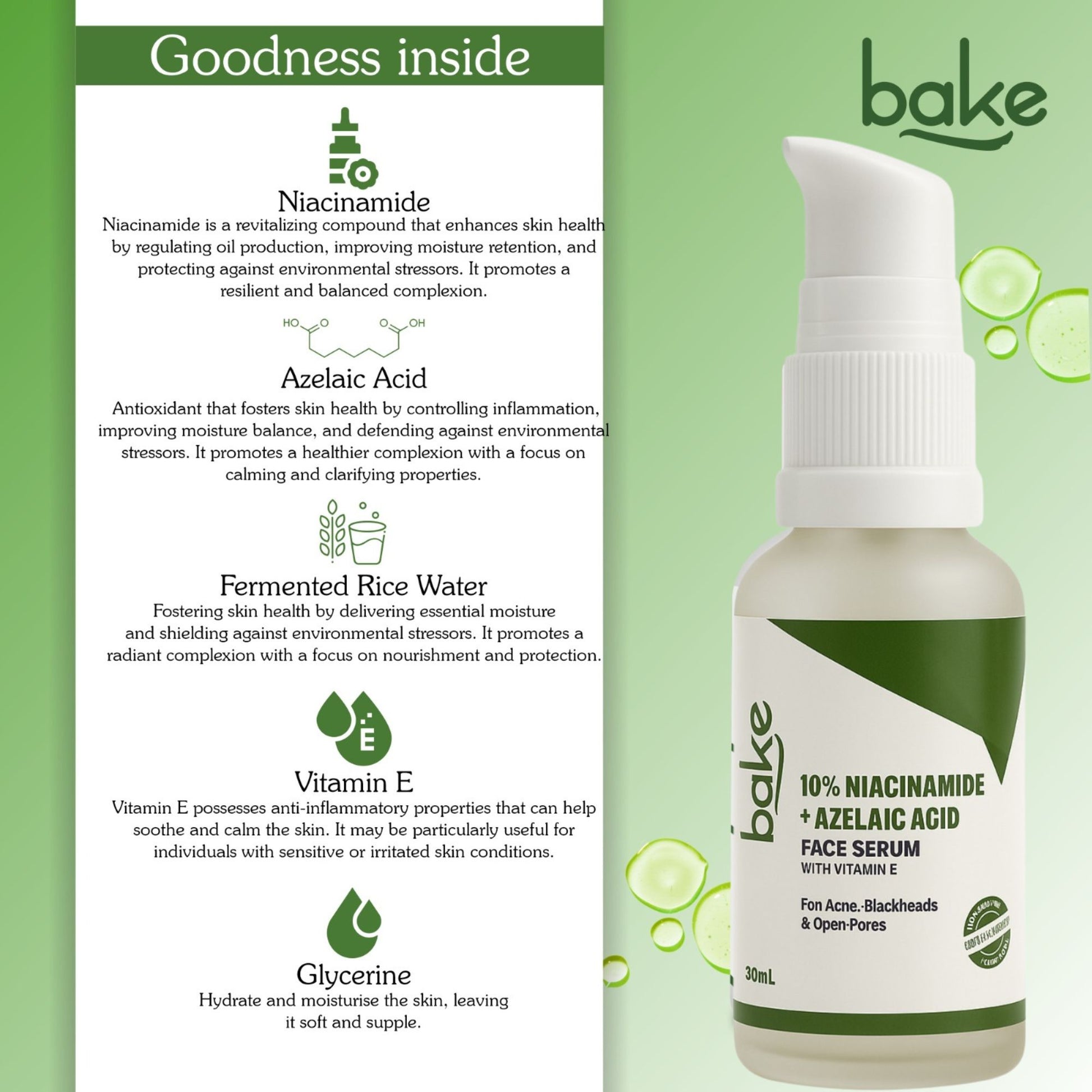 BAKE 10% Niacinamide + Azelaic Acid Face Serum includes potent blend of Kojic Acid and Rice Water, which work synergistically to lighten pigmentation caused by acne, gradually fading acne marks for a clearer & brighter complexion.