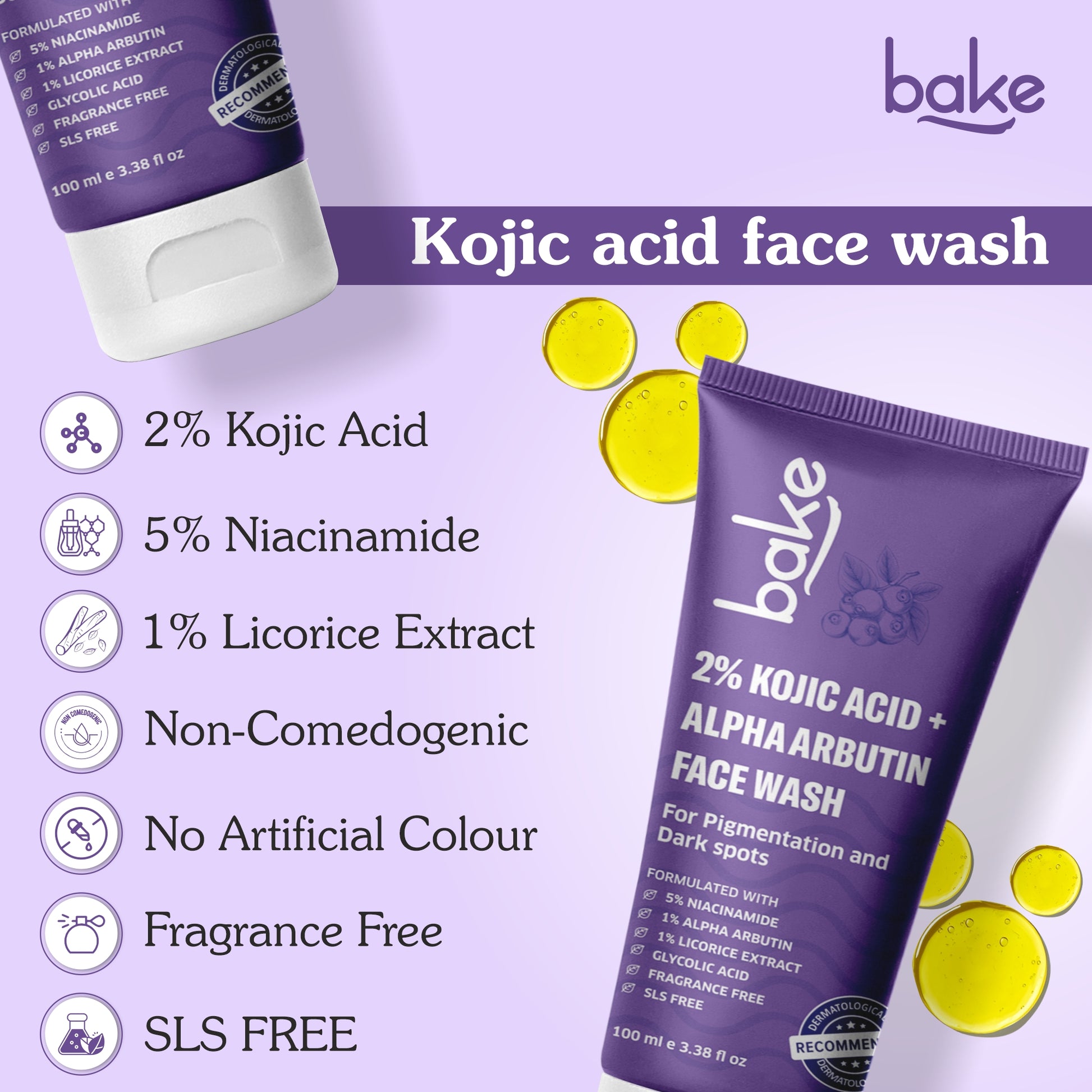 Bake 2% Kojic Acid + Alpha Arbutin Face Wash & Soap is a powerful anti-pigmentation skincare combo designed to visibly reduce dark spots, acne marks, and uneven skin tone. Enriched with Kojic Acid and Alpha Arbutin, it helps brighten the skin and inhibit melanin production for a clearer complexion. The formula is infused with Niacinamide and Licorice Extract to soothe skin, improve texture, and boost radiance. Gentle exfoliating acids help remove dead skin cells and impurities without over-drying. This fragrance-free, SLS-free duo deeply cleanses while maintaining the skin’s natural moisture balance. Suitable for daily use, it promotes smoother, healthier-looking skin. With consistent use, skin appears brighter, more even-toned, and refreshed. Ideal for all skin types dealing with pigmentation concerns.