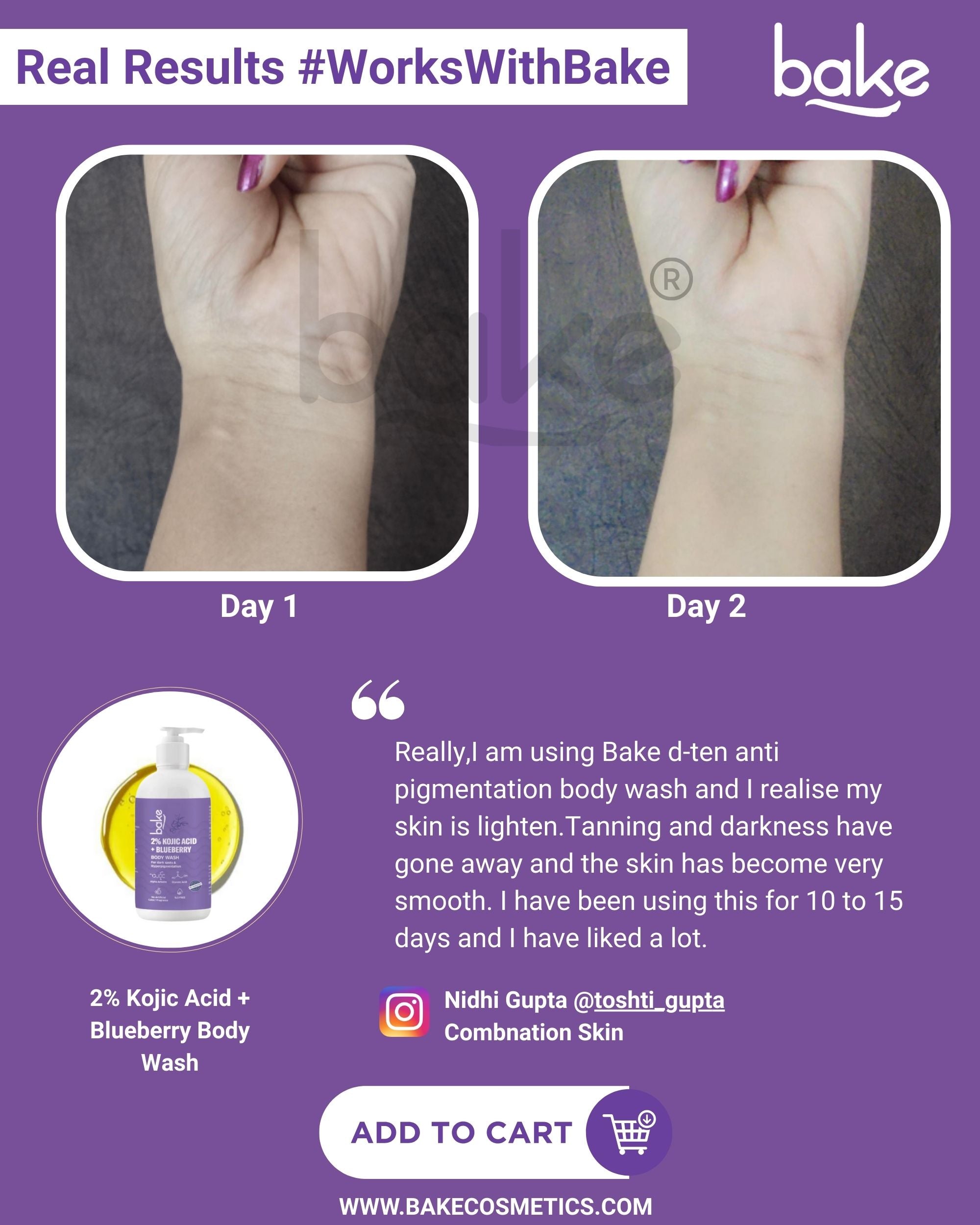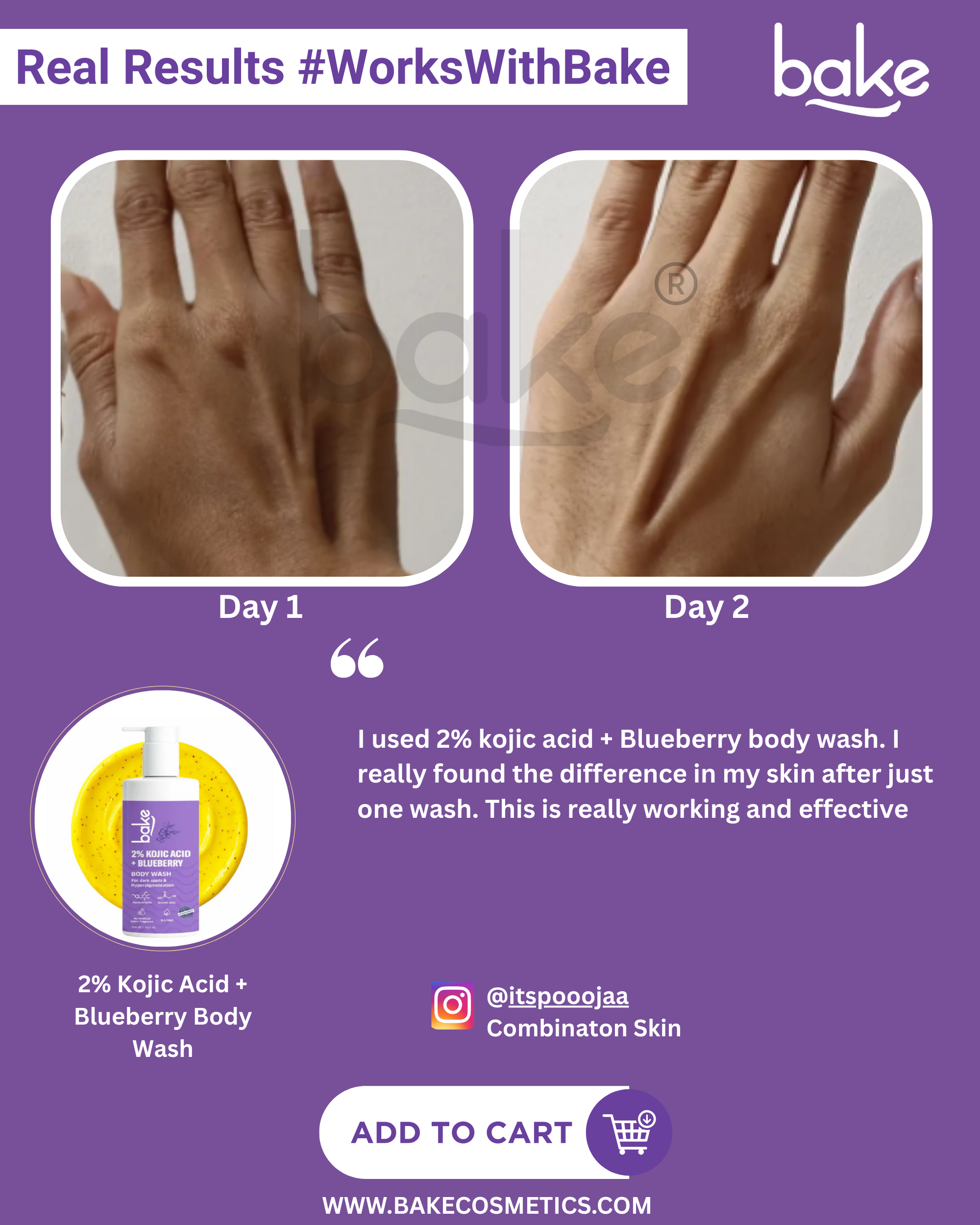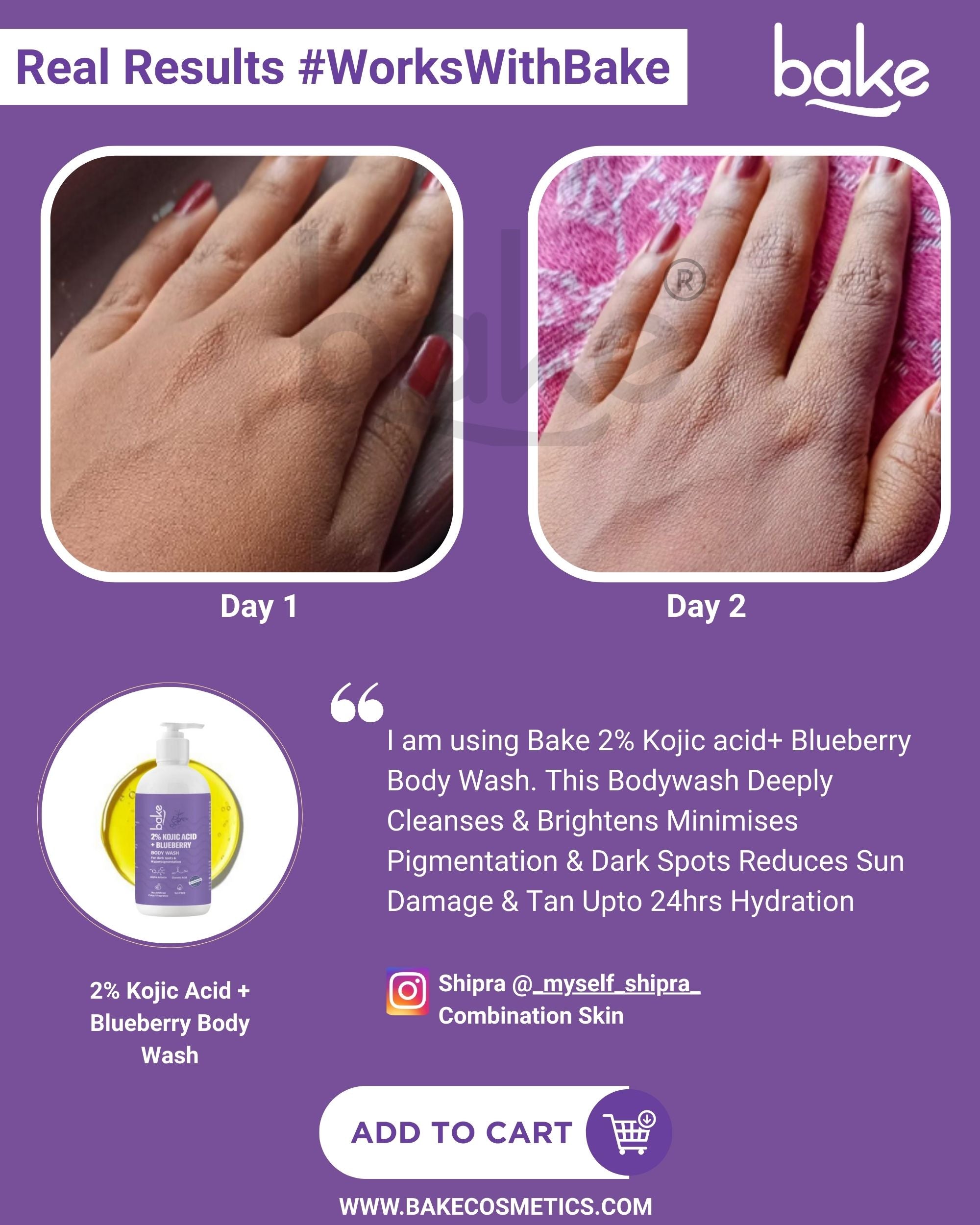 BAKE 2% Kojic Acid Body Wash is carefully formulated to inhibit melanin production, promoting a visibly brighter and more even complexion. By promoting a reduction in dark spots and an even skin tone, Kojic Acid contributes to a brighter and more radiant complexion. This can result in a healthier and more youthful appearance.