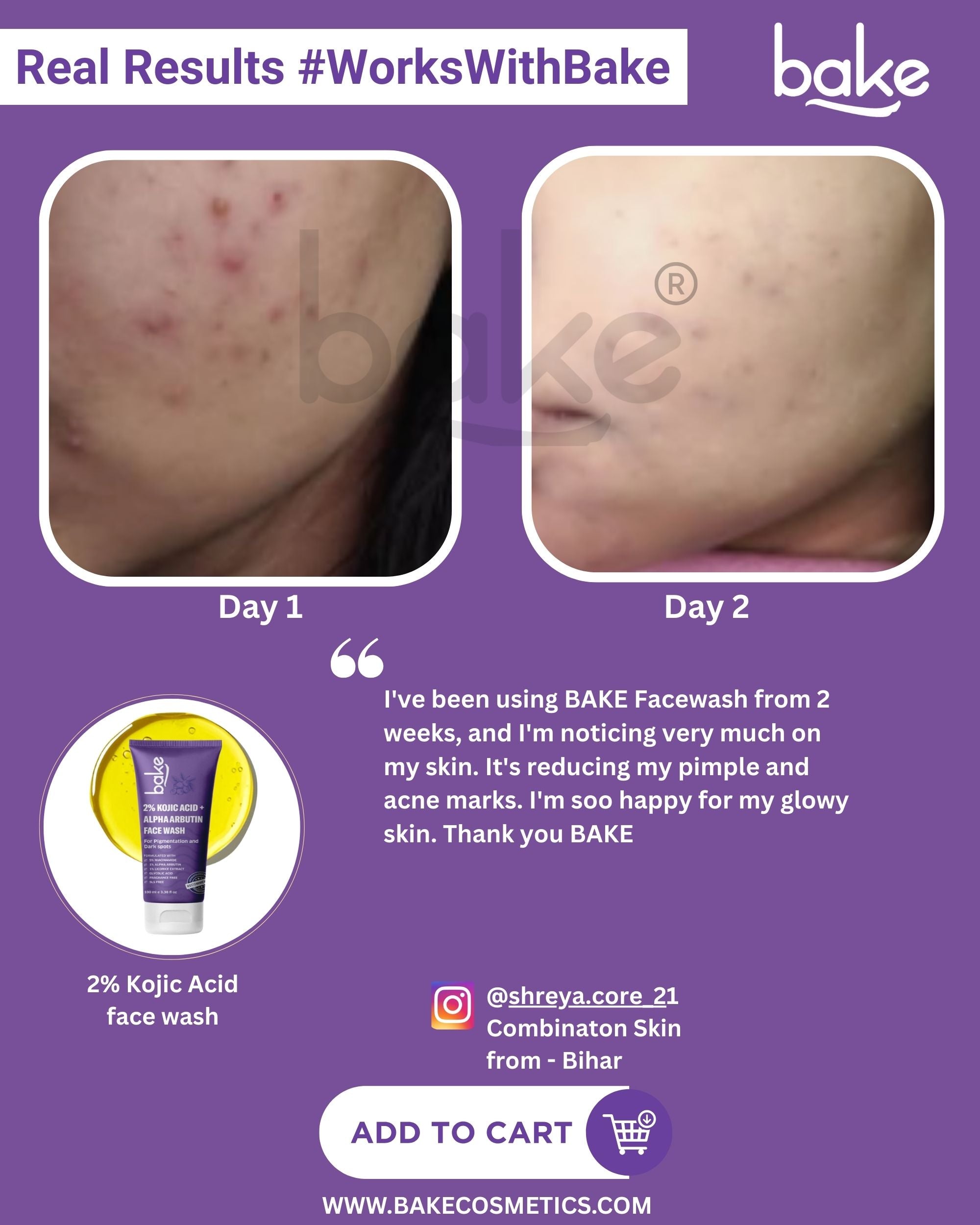 BAKE 2% Kojic Acid Face Wash reduces pigmentation and dark spots by inhibiting melanin production. Kojic Acid lightens the skin, while Alpha Arbutin minimizes dark spots and discoloration, promoting a more even and radiant complexion