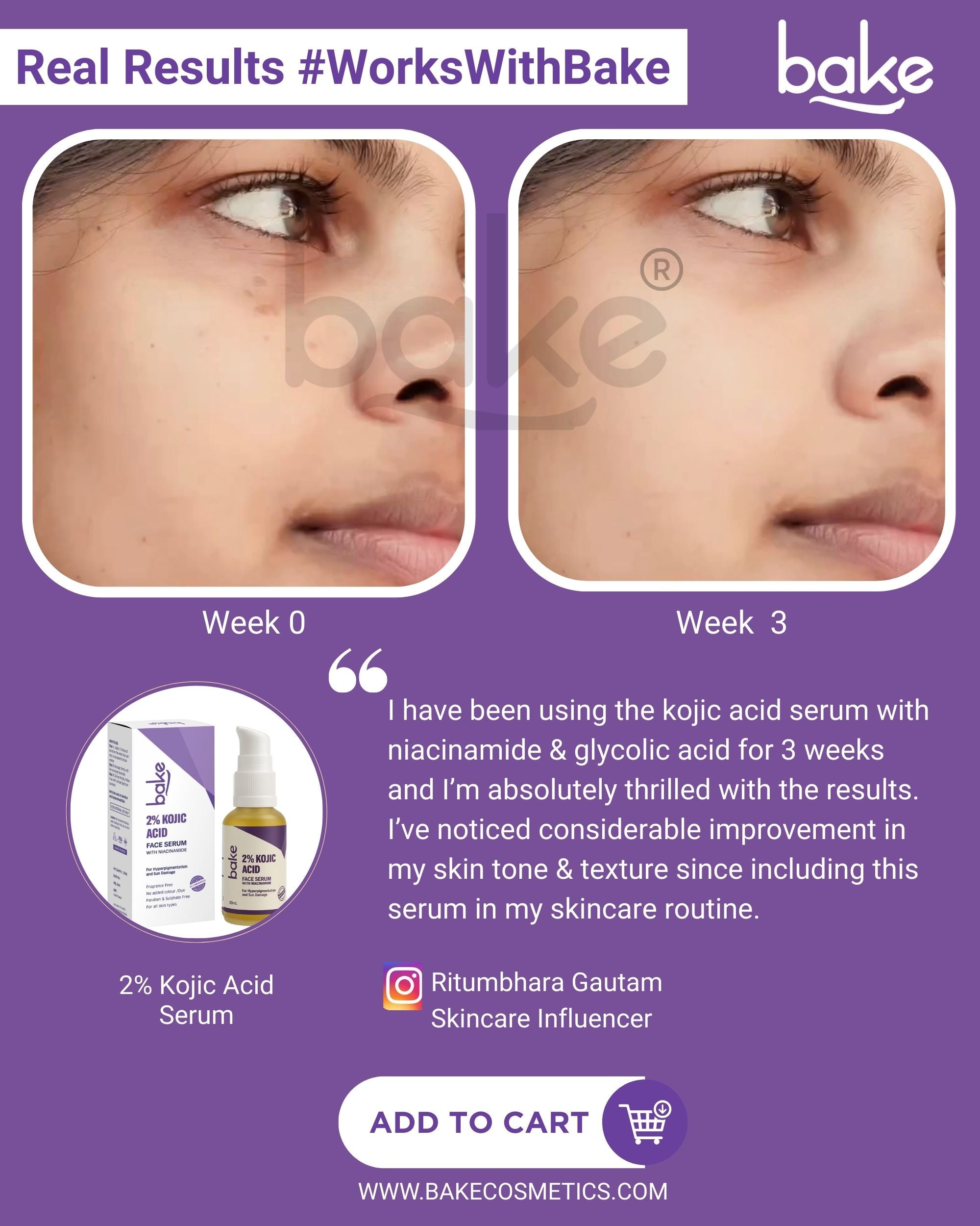 BAKE 2% Kojic Acid Serum contains potent combination of Glycolic acid & Niacinamide which work synergistically to exfoliate damaged skin cells, revealing healthier skin underneath, while kojic acid helps inhibit melanin production, reducing the appearance of sun damage such as sun spots and pigmentation